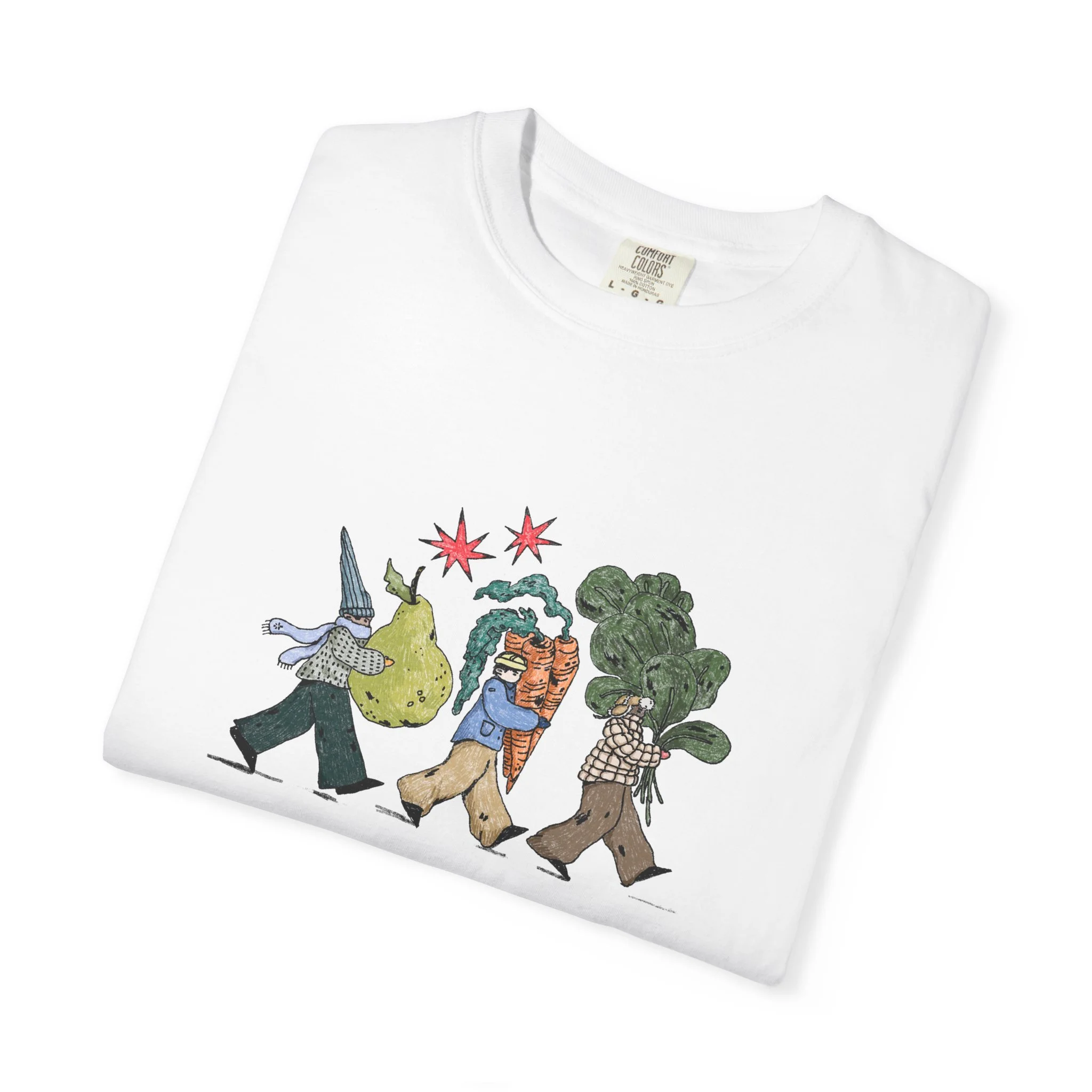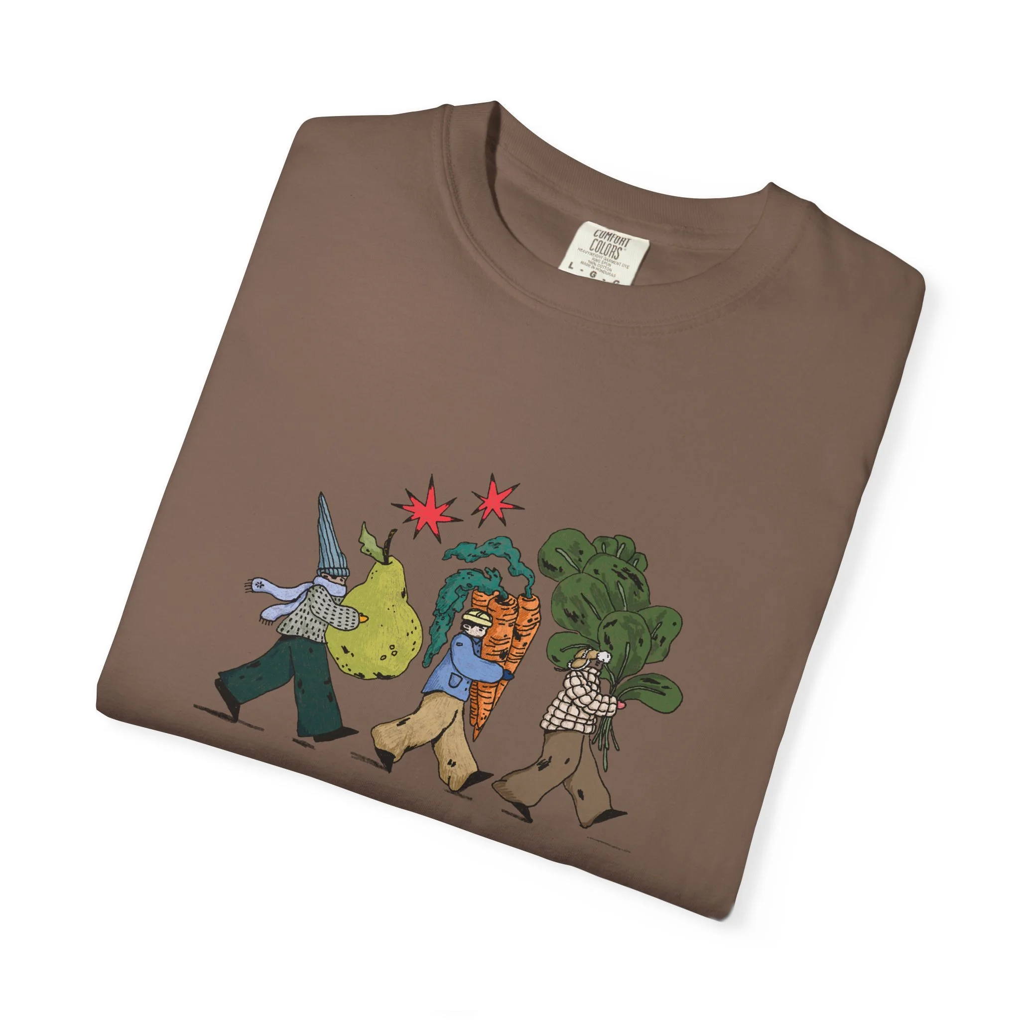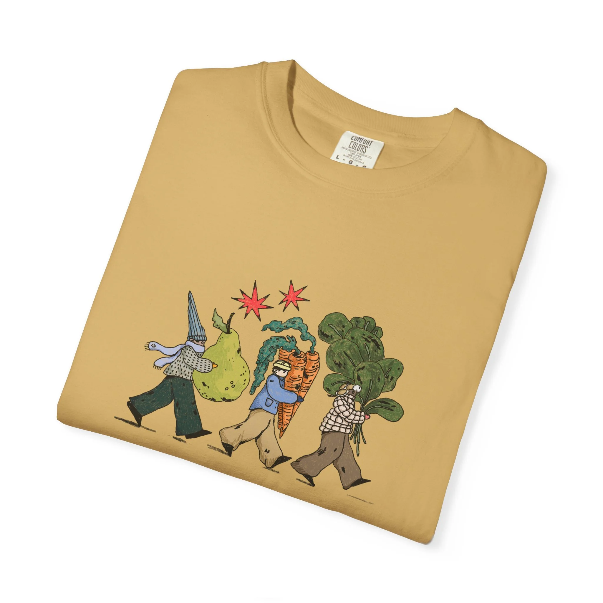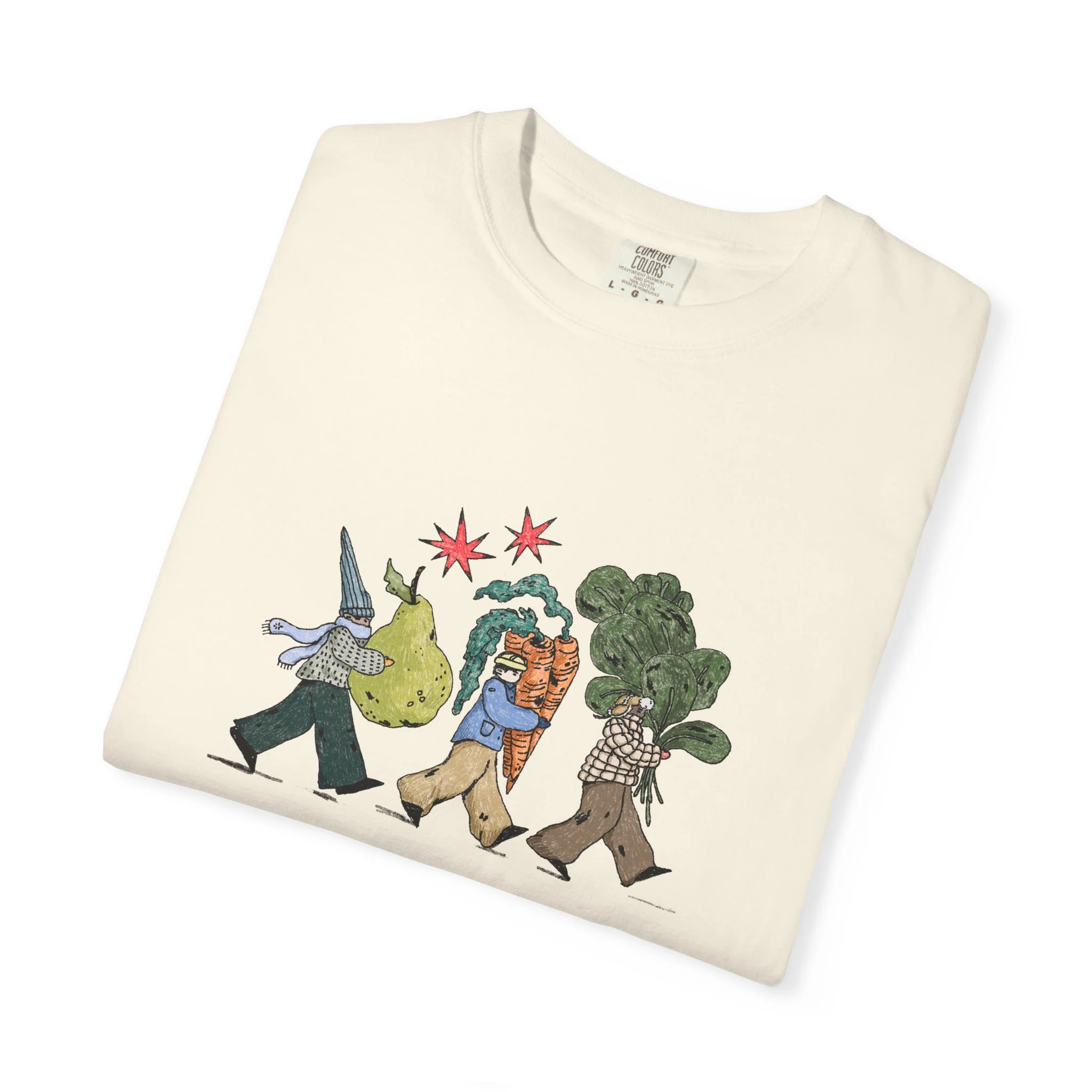 This relaxed, garment-dyed tee brings a quiet, playful moment to everyday wear. A soft, broken-in hand and heavyweight cotton give the shirt a lived-in feel right away — like a favorite you reach for on slow mornings and long walks. The front illustration shows three figures carrying oversized treasures, rendered in warm, textured colors that read like a sketchbook memory. It’s the kind of shirt that layers easily under a flannel or stands alone with worn denim, carrying a subtle story without shouting. Choose from a wide range of muted dye shades to match your palette and wear it through seasons when comfort and character matter most.