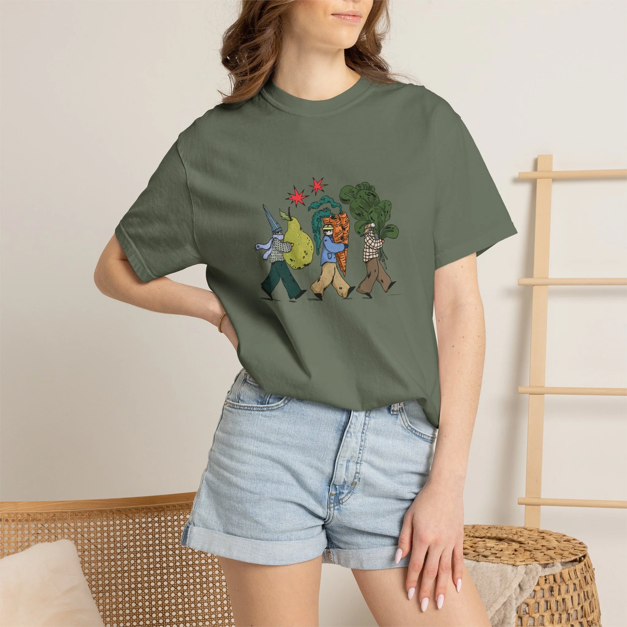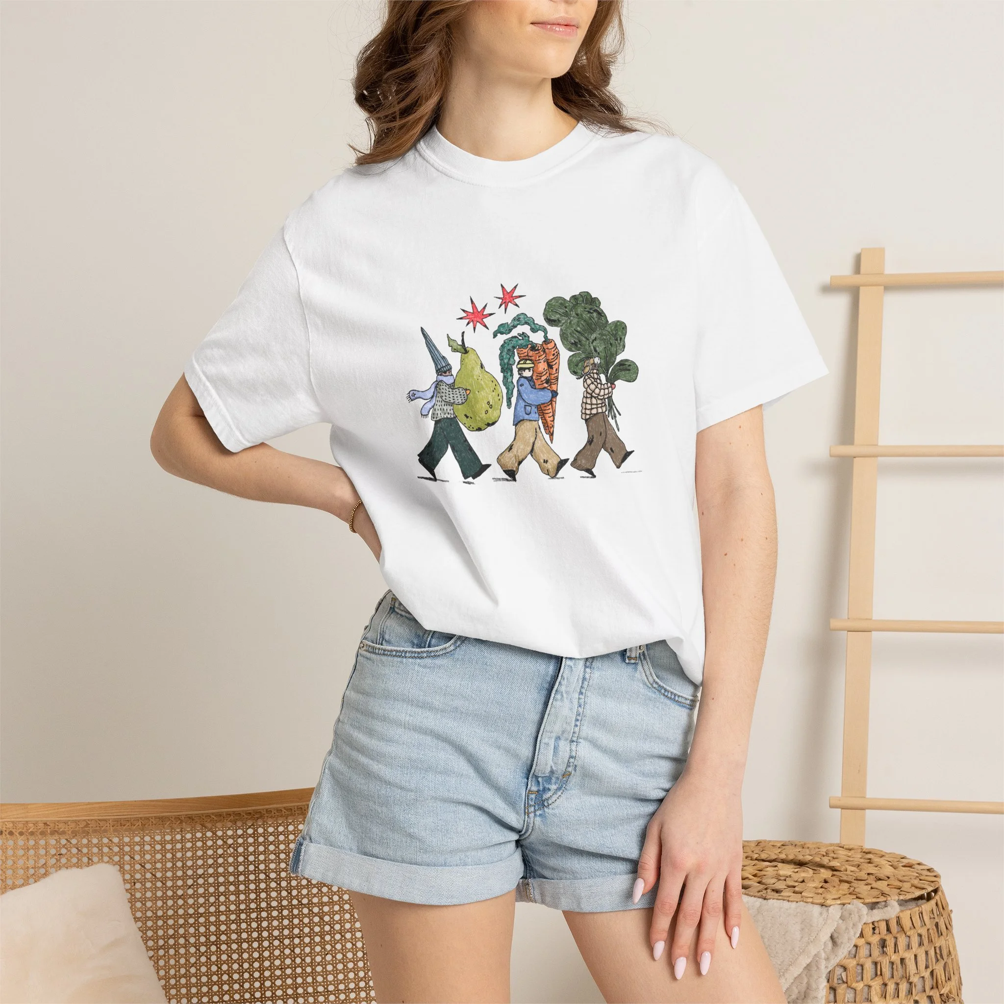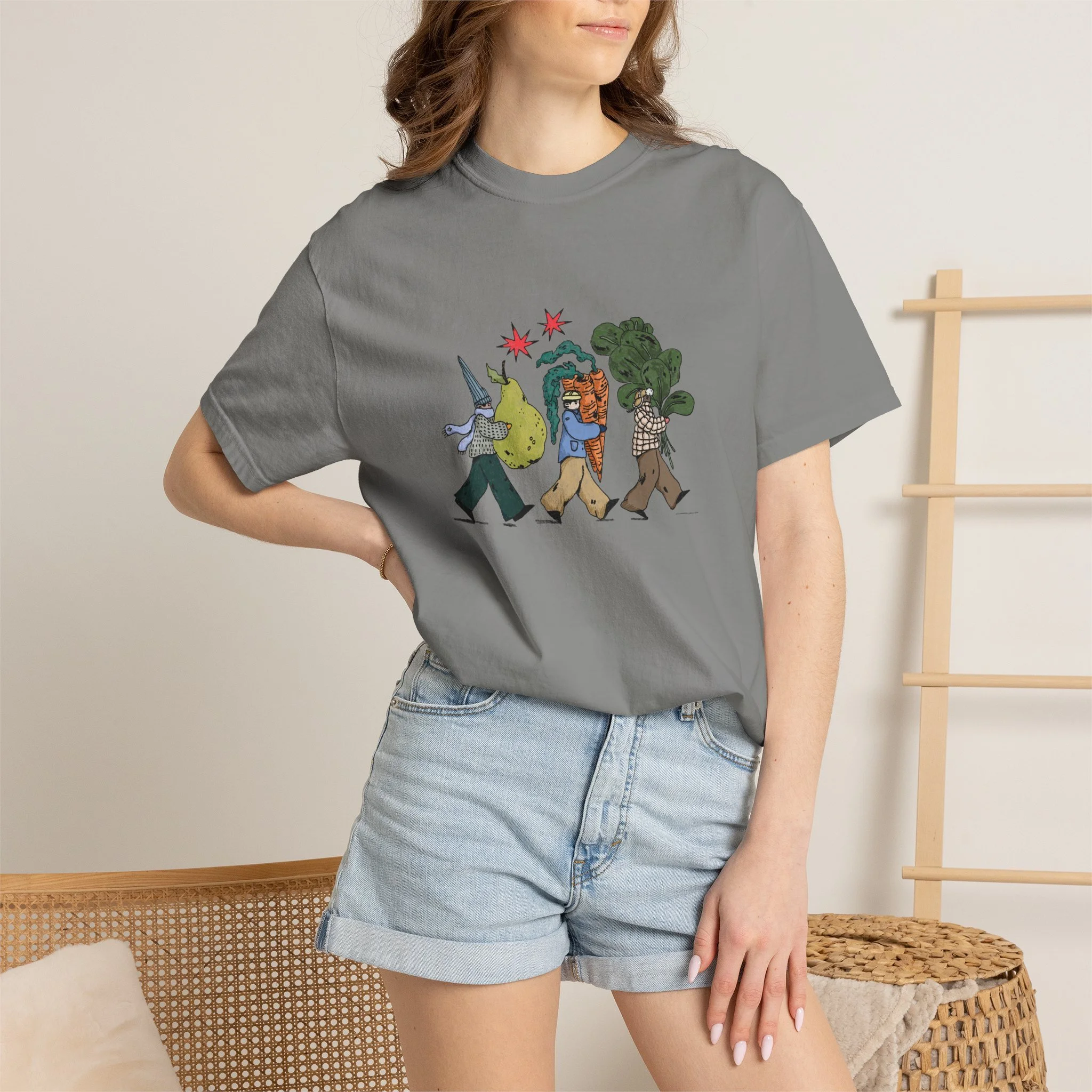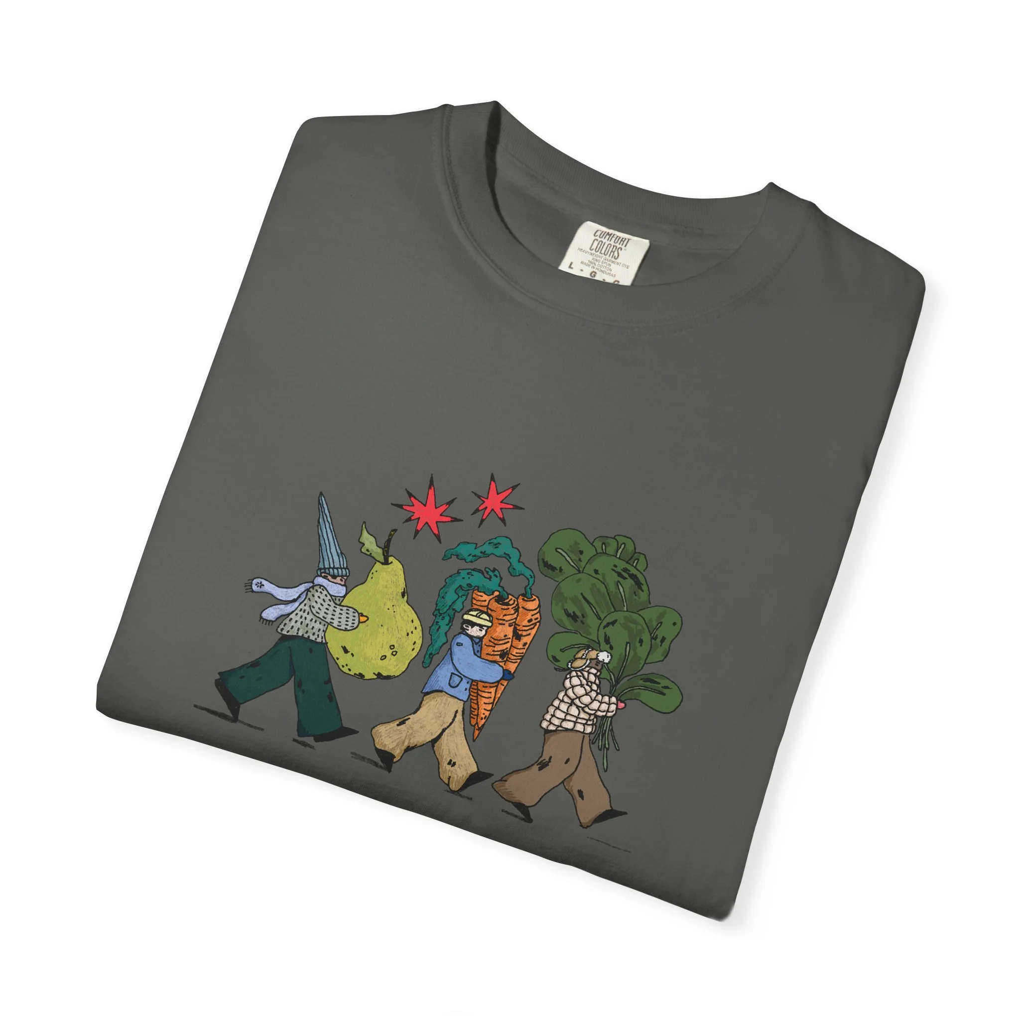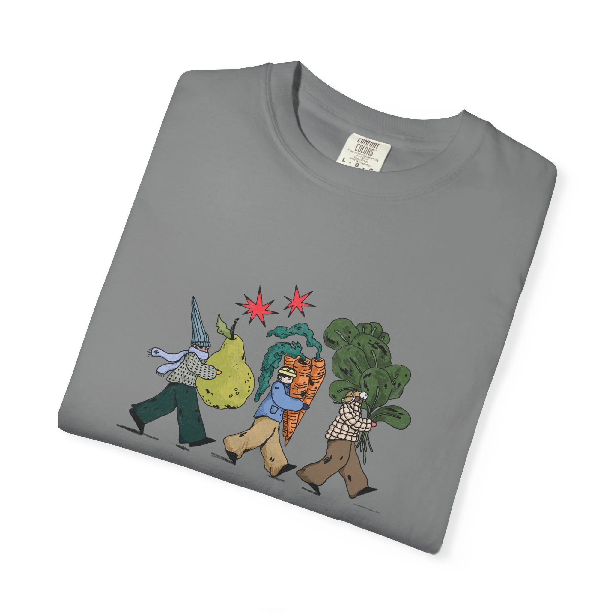This relaxed, garment-dyed tee brings a quiet, playful moment to everyday wear. A soft, broken-in hand and heavyweight cotton give the shirt a lived-in feel right away — like a favorite you reach for on slow mornings and long walks. The front illustration shows three figures carrying oversized treasures, rendered in warm, textured colors that read like a sketchbook memory. It’s the kind of shirt that layers easily under a flannel or stands alone with worn denim, carrying a subtle story without shouting. Choose from a wide range of muted dye shades to match your palette and wear it through seasons when comfort and character matter most.