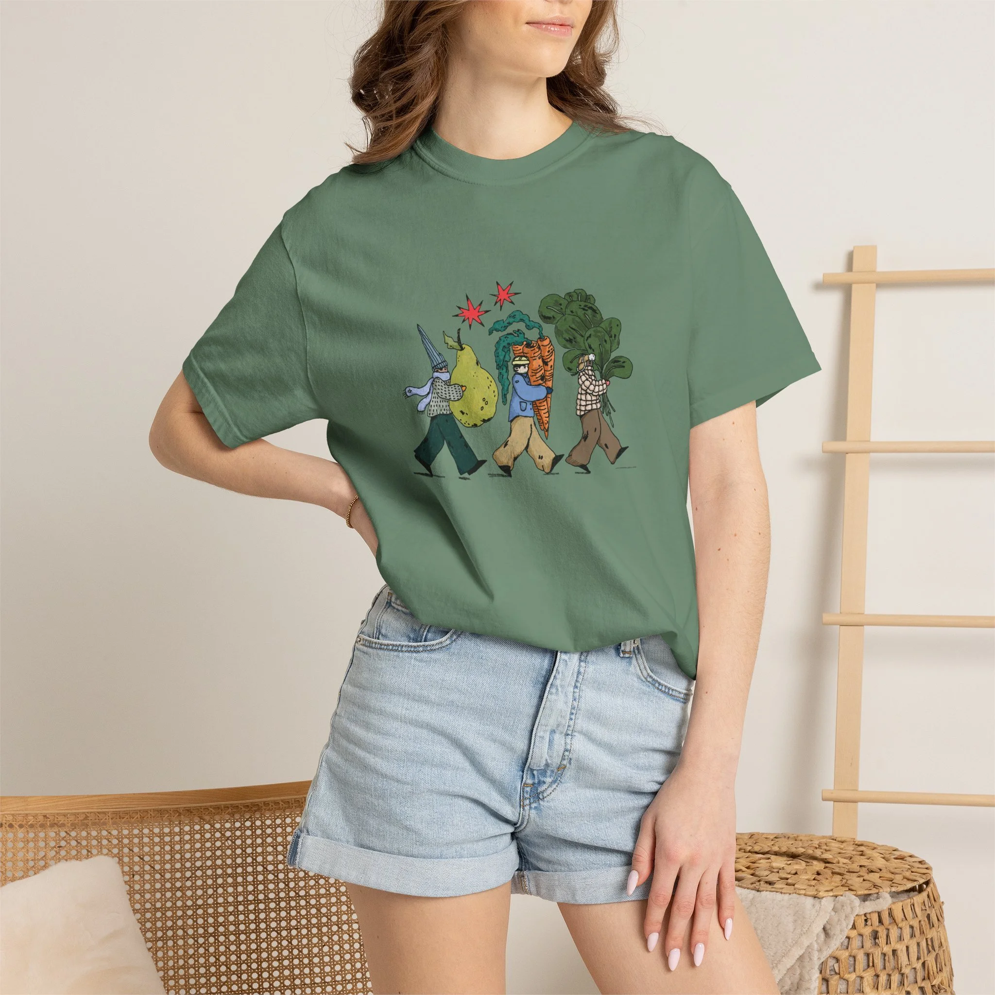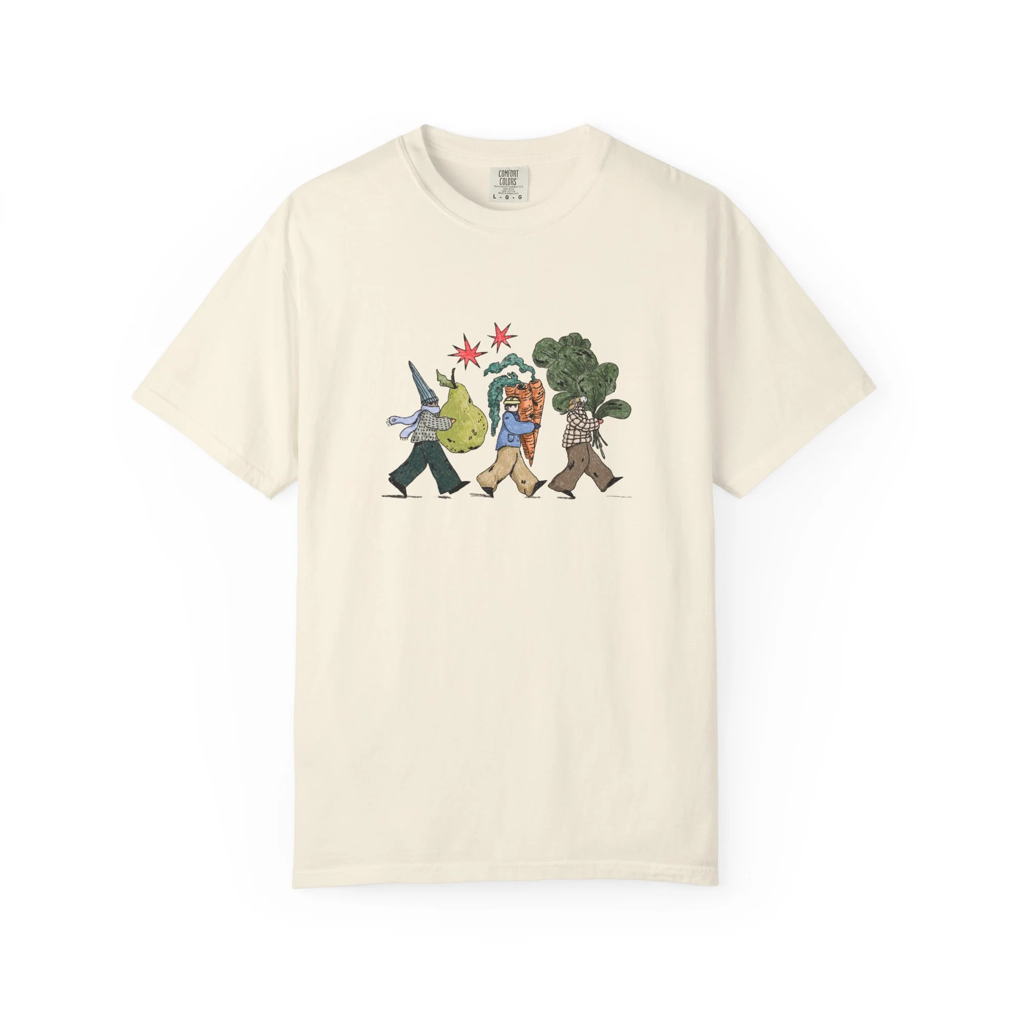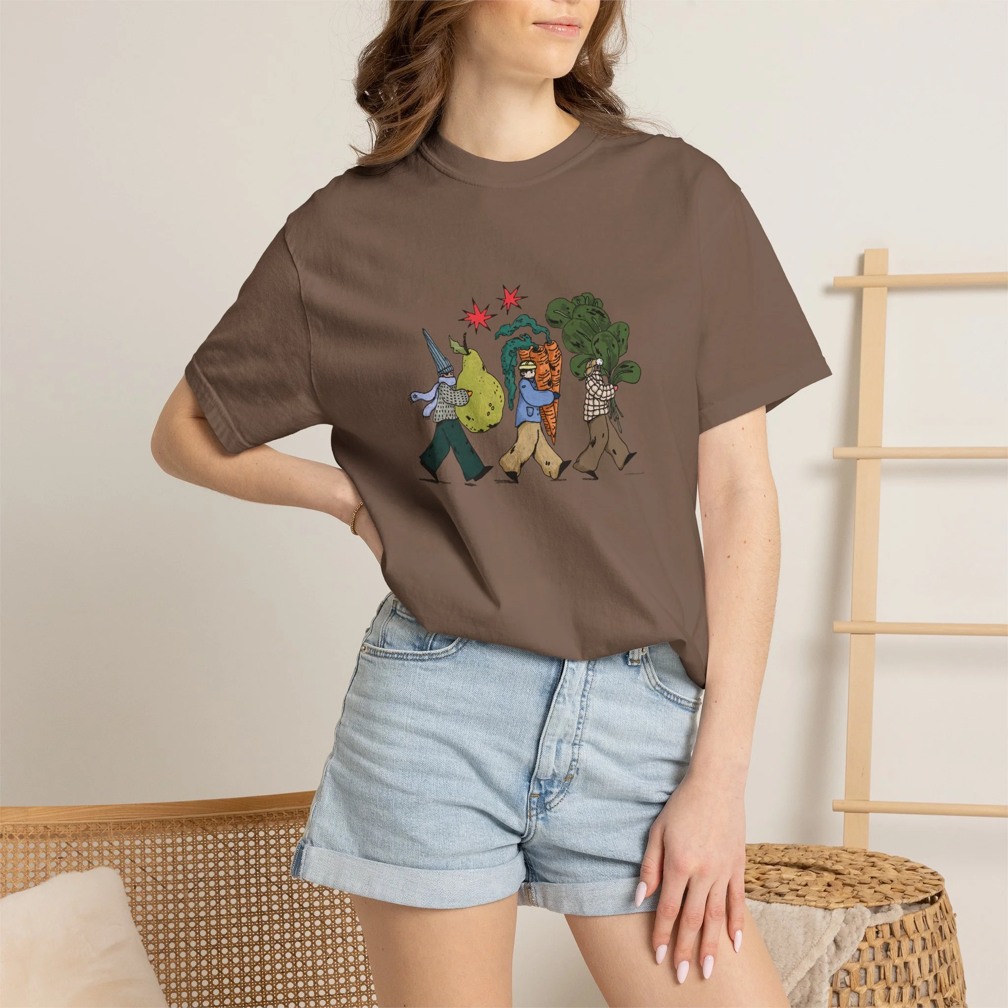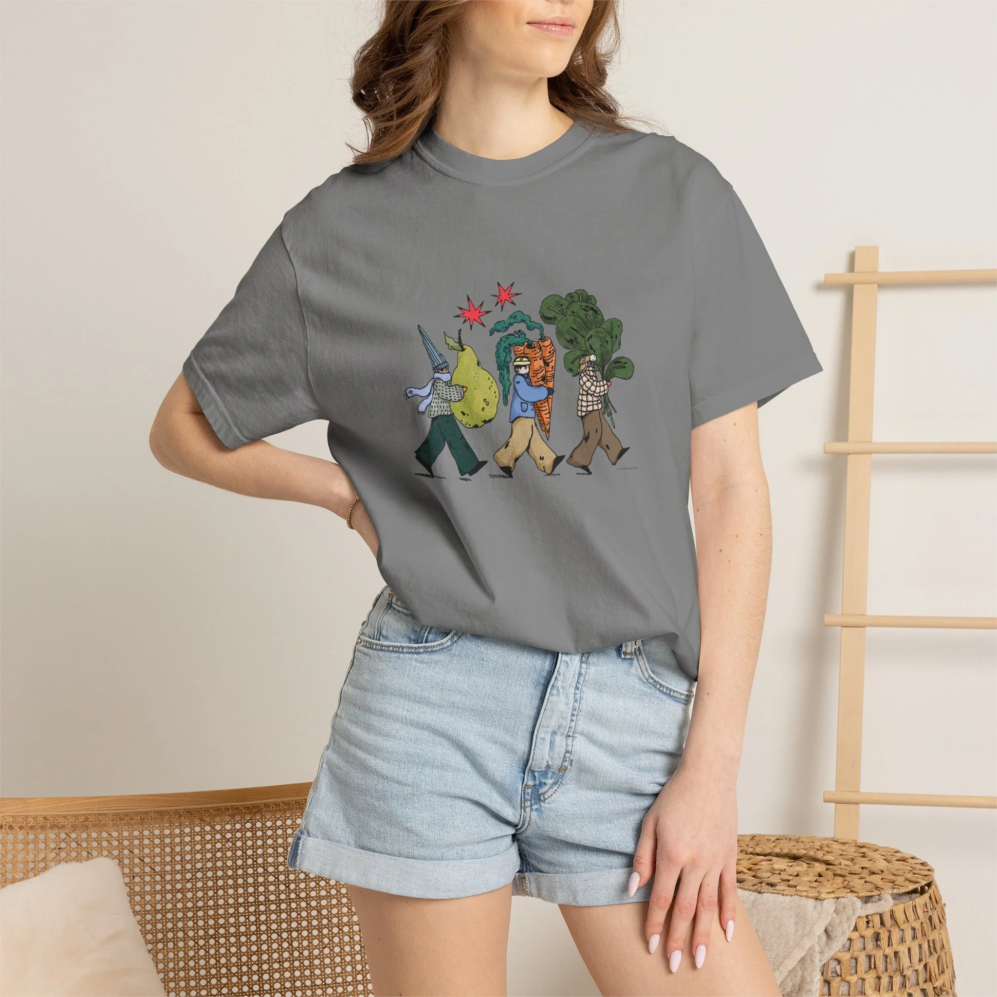 This relaxed, garment-dyed tee brings a quiet, playful moment to everyday wear. A soft, broken-in hand and heavyweight cotton give the shirt a lived-in feel right away — like a favorite you reach for on slow mornings and long walks. The front illustration shows three figures carrying oversized treasures, rendered in warm, textured colors that read like a sketchbook memory. It’s the kind of shirt that layers easily under a flannel or stands alone with worn denim, carrying a subtle story without shouting. Choose from a wide range of muted dye shades to match your palette and wear it through seasons when comfort and character matter most.