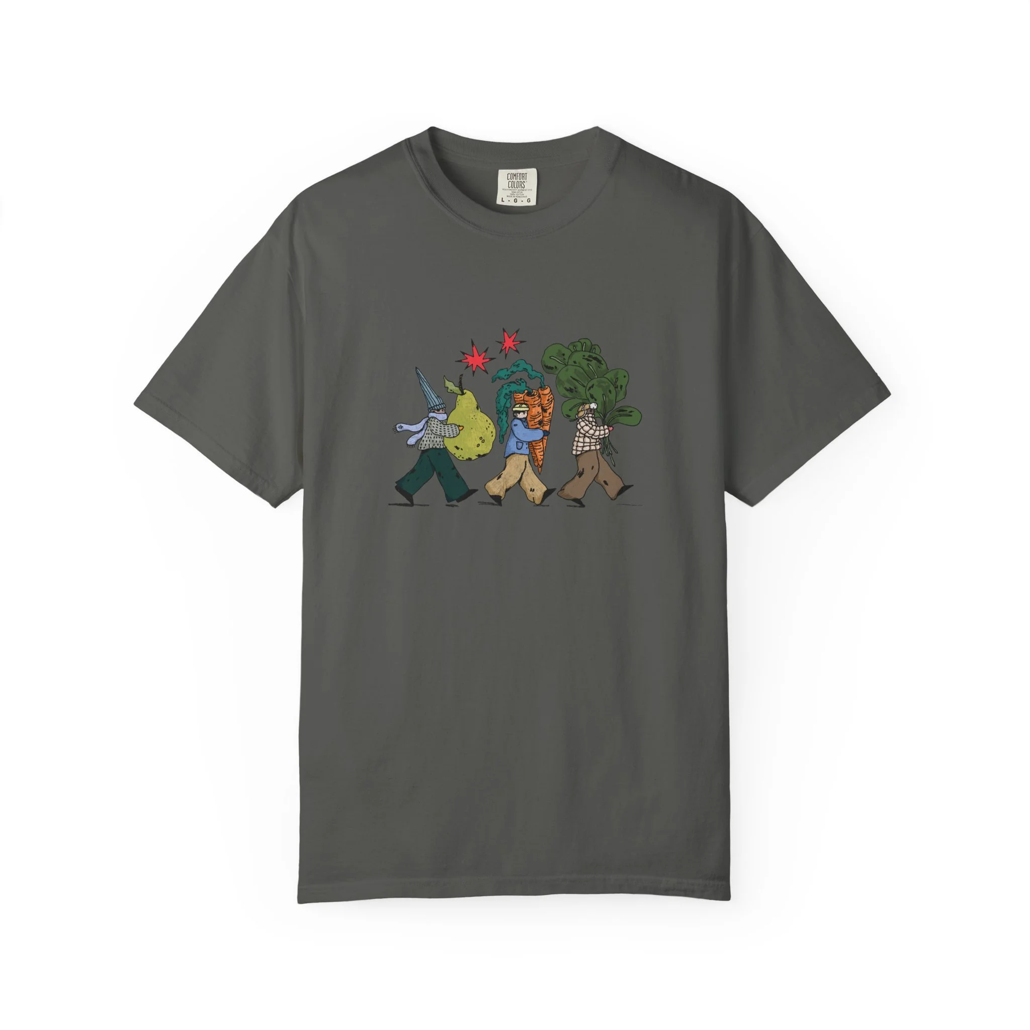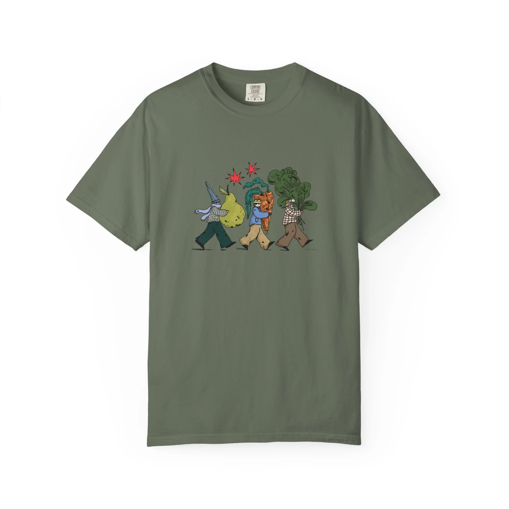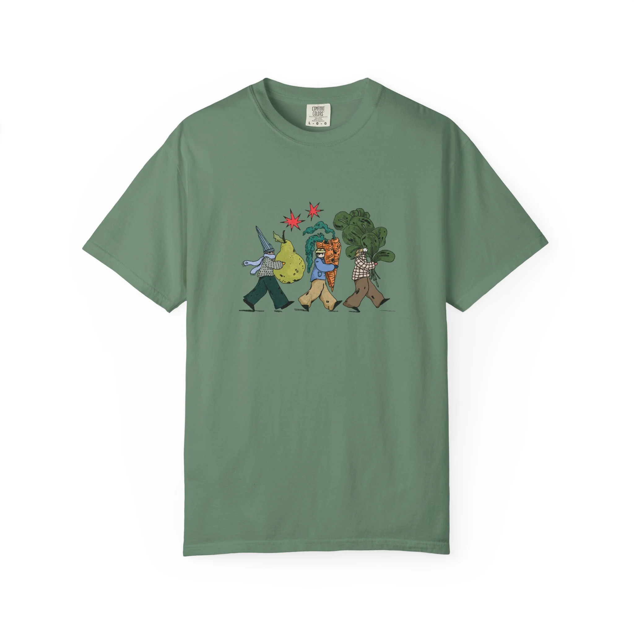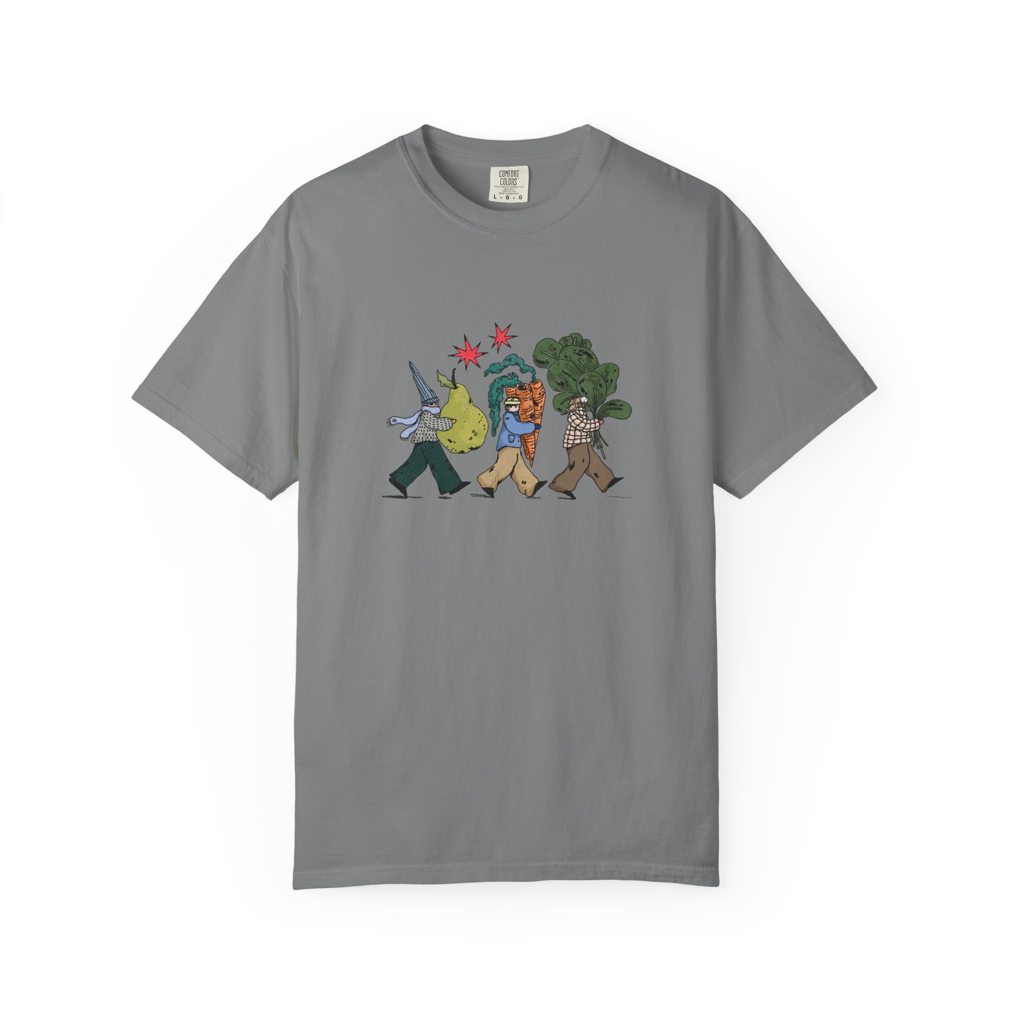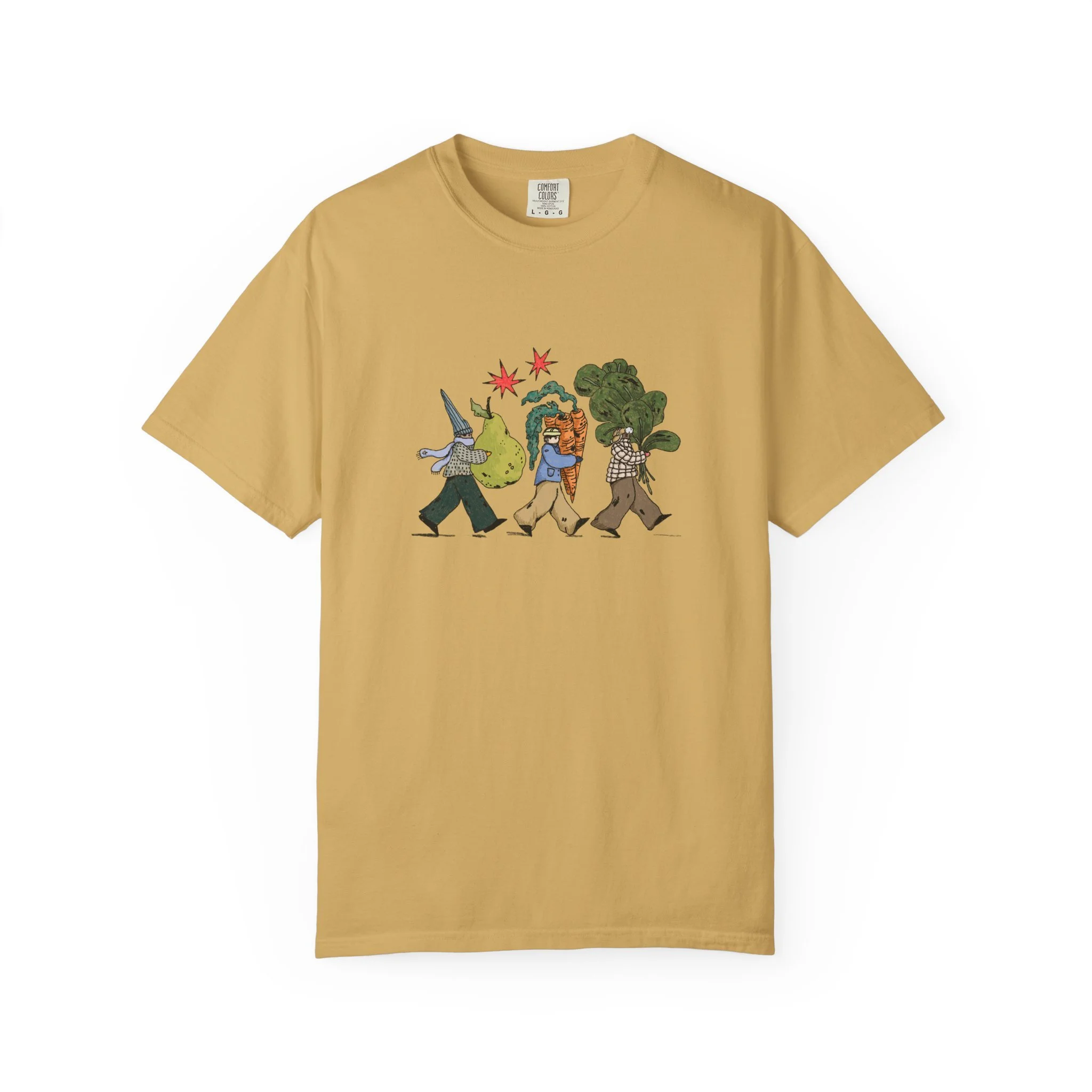This relaxed, garment-dyed tee brings a quiet, playful moment to everyday wear. A soft, broken-in hand and heavyweight cotton give the shirt a lived-in feel right away — like a favorite you reach for on slow mornings and long walks. The front illustration shows three figures carrying oversized treasures, rendered in warm, textured colors that read like a sketchbook memory. It’s the kind of shirt that layers easily under a flannel or stands alone with worn denim, carrying a subtle story without shouting. Choose from a wide range of muted dye shades to match your palette and wear it through seasons when comfort and character matter most.